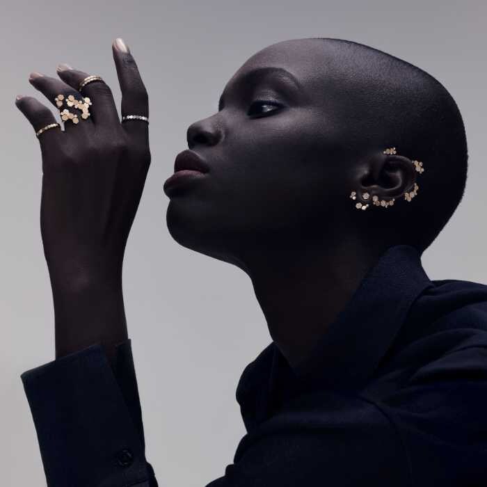 新作では、鏡面仕上げのハニカムモチーフが連なるリングや、耳元に洗練を添えるイヤーカフ、ミニマルで美しいペンダントなどが登場。