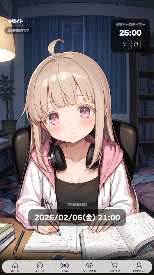 配信は60分間ですが、視聴者からのギフトで一定時間自動的に延長されます。配信終了間際には、イトが残り時刻を知らせてくれます。また、視聴時間に応じて応援ポイントがもらえたり、ライブ延長時間に応じて実績バッジがもらえたりと、みんなで一緒に盛り上がれる要素も盛り沢山です。なお、配信していない時間は、キャラクターの作業風景とともに作業に便利なポモドーロタイマーがご利用いただけます。