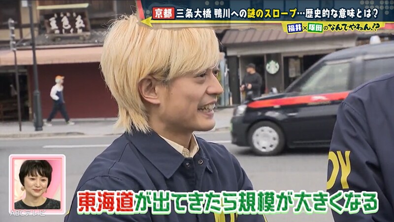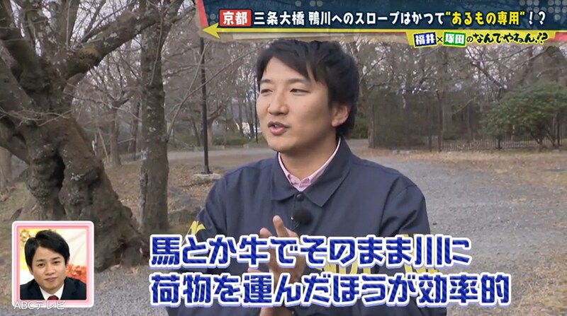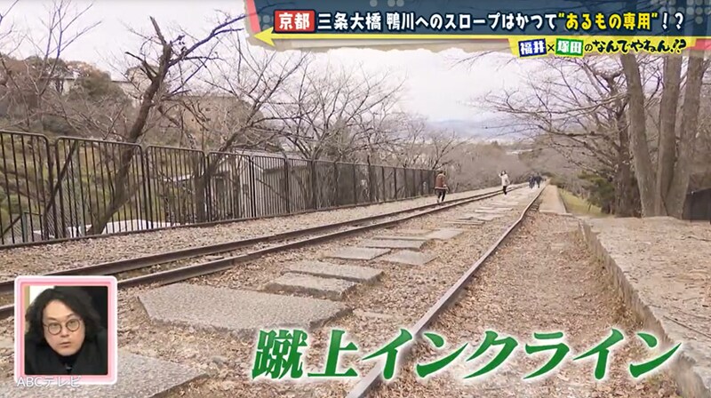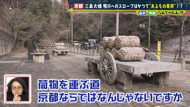 鴨川へスムーズに下りられる謎のスロープは、傾斜が緩やかで、人が通るには十分すぎるほど広い。この地が東海道五十三次の西の起点だと知った塚田は、「(この地はかつて栄えていて)お店もいっぱいあって、いろんな物が売られていたって考えると、物を運ぶとかじゃないの?」「(謎のスロープは)江戸時代に物資運搬の荷車が通るためのもの」と予想した。