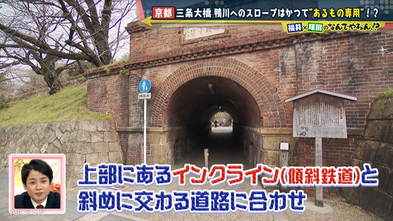 さっそく蹴上エリアにやってきた塚田と福井アナは、「ねじりまんぽ」という名のレンガ造りのトンネルと、その上に伸びる蹴上インクラインを発見した。蹴上インクラインといえば、京都と滋賀県大津をつなぐ人工水路・琵琶湖疏水の上流と下流を結ぶ傾斜鉄道として有名だ。今は自由に散策できる観光地だが、かつては約36メートルの高低差をカバーするために舟ごと台車に乗せ、ケーブルカーと同じ原理で運んだという。