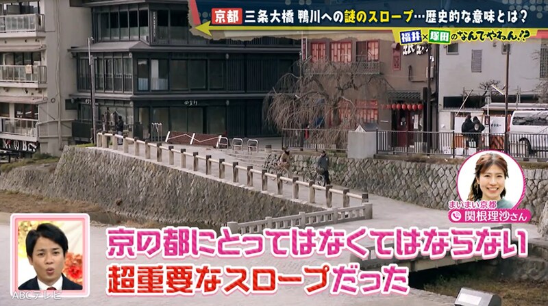 なお、三条大橋の謎のスロープは、情報番組『newsおかえり』(毎週月曜~金曜午後3時40分、ABCテレビ)内の「福井×塚田のなんでやねん!?」1月27日放送回で紹介された。