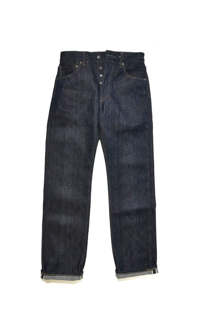 経糸1.5番、緯糸1.5番という極太糸を使用した27.5オンスの超ヘビージーンズ。ボタンホールは機械縫いでは生地切れを起こすため、職人が手でかがるほかない。糸仕様では、穿いていて負担の掛かる箇所には、0番手の糸、バックポケットのボールマークステッチは特注で染めた0番手のオレンジ糸を使用するなどディテールもこだわり抜いた。脇や尻ぐりなど多重生地部分はハンマーで叩き込み、腱鞘炎必至の過酷な重労働であるため1日に2〜3本しか完成しない実に職人泣かせなジーンズだ。¥60,500_(30〜38インチ)、¥63,800_(40〜42インチ)