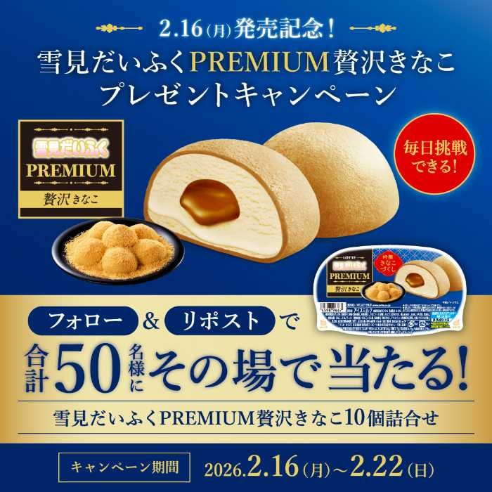 発売を記念して、雪見だいふく公式Xアカウント「@yukimi_lotte」では、抽選で合計50名様に『雪見だいふくPREMIUM贅沢きなこ』10個セットが当たるプレゼントキャンペーンを実施♪