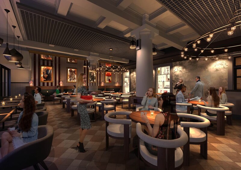 外観のひときわ存在感を放つファサードを抜けると、オリジナルのビッグシャンデリアが印象的な、グラマラスで奥行きのある空間が広がります。