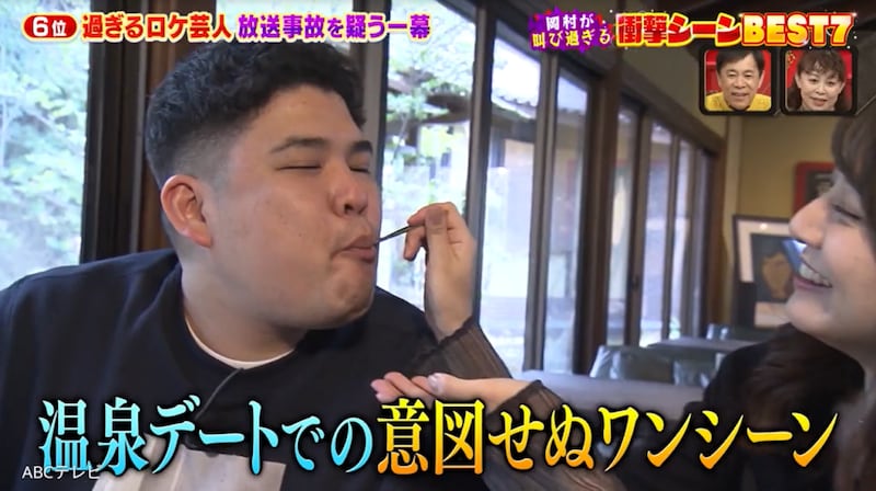 ラブラブデートVTRで岡村たちが特に叫んだのは、有馬温泉での意図せぬワンシーンだ。気持ちよさそうに温泉に浸かるれなちゃんをカメラがとらえたあと、一瞬の間を置いて画面に映ったのは、なんと体の大事な部分……! 大事な部分が温泉からチラ見えする際どいショットに、岡村は思わず慌てた。