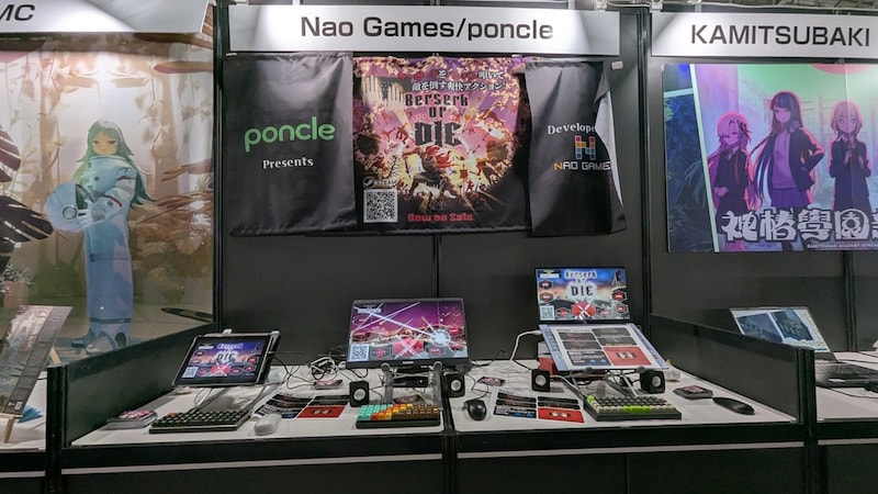 昨年のガジェット通信賞受賞作品「Last Standing」が、「Vampire Survivors」開発元のponcleによるパブリッシュで「Berserk or Die」としてリリース。今年のBitSummitに続き、東京ゲームショウでもパブリッシャーのponcleと開発元のNao Gamesの共同ブースとして出展。バンバン叩いてプレイできるメカニカルキーボードをそろえて試遊台を用意していました。