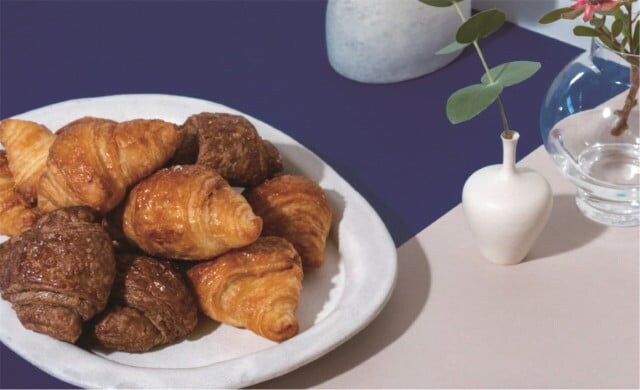 「ミニヨン」は、福岡・博多で約30年にわたり、行列の絶えない人気を誇るミニクロワッサン専門店です。創業以来こだわりの”手折り製法”が生む、“外はサクッ、中はモチッ! ”な食感と、焼きたての香ばしい香りが魅力。食べやすいひと口サイズで 1個から購入できるほか、お得なセットもスタンバイします。