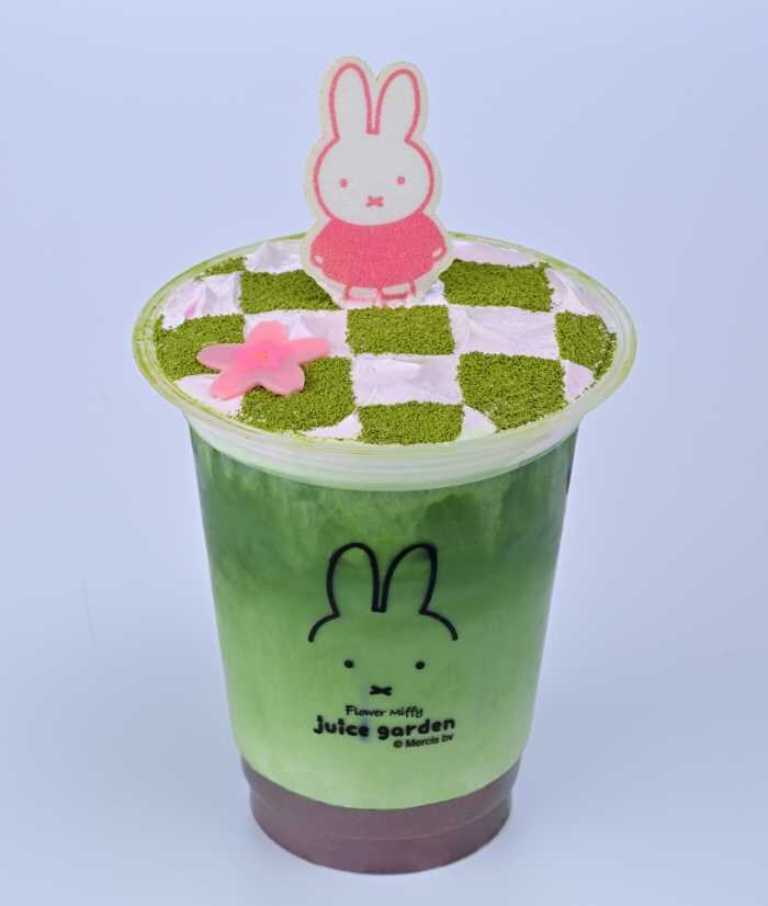「フラワーミッフィー さくらグリーンミルクティー(ICE)」は、抹茶の豊かな香りとミルクのまろやかさが調和した冷たい一杯。さくらのやさしい風味が後味にふんわり広がります。
