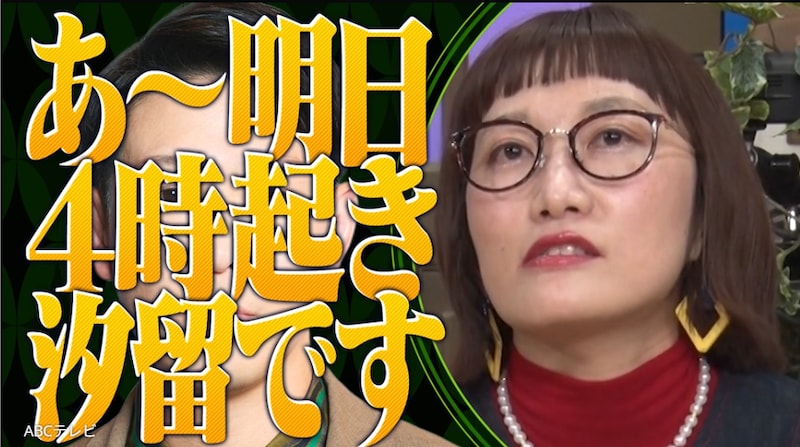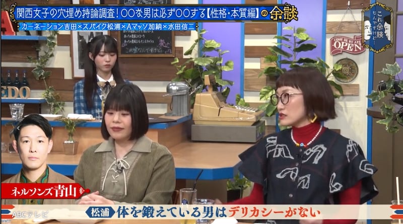 関西女子たちの「○○な男は必ず○○する」という持論が発表される中、「体を鍛えている男はデリカシーがない。俺が最強だと思っているから周りが見えてない」と切り出した松浦。彼女が言う体を鍛えている男とは、NSCの同期でアマチュアレスリングの日本代表選手だったこともあるネルソンズ青山フォール勝ちのこと。「もうホントにデリカシーがなくて、みんなでいる大楽屋なのに、一番大きな声で『あ〜明日4時起き汐留です』とか言ったりする」と嘆いた。