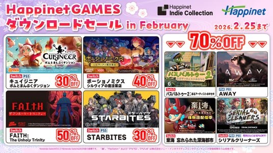 株式会社ハピネット(本社:東京都台東区、代表取締役社長:水谷 敏之、証券コード:7552)は、自社パブリッシングタイトルがお得に購入できる『HappinetGAMES ダウンロードセール in February』を、2026年2月25日(水)まで実施します。