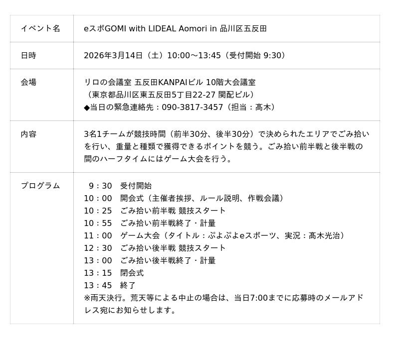 株式会社Life Reversal Gaming.(所在地:東京都中央区、代表:高木 光治)は、2026年3月14日(土)に開催される「eスポGOMI with LIDEAL Aomori in 品川区五反田」の運営に、eスポGOMI開催委員会(一般財団法人日本財団スポGOMI連盟/株式会社Life Reversal Gaming./横濱OneMM)の一員として参画いたします。