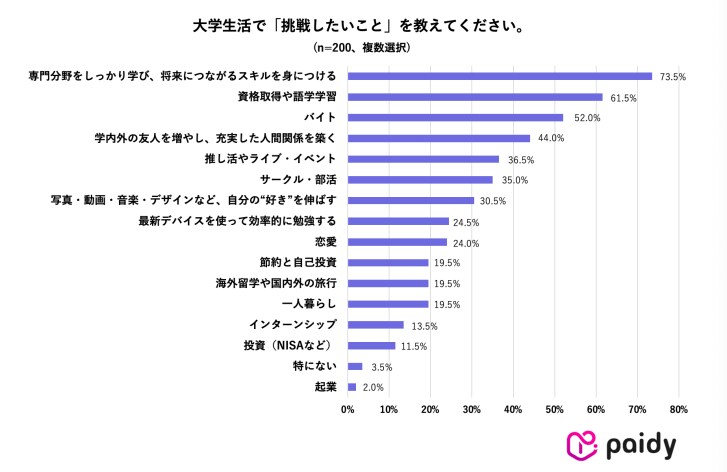 調査によると、新大学生が大学生活で挑戦したいことの1位は「専門分野をしっかり学び、将来につながるスキルを身につける」。
