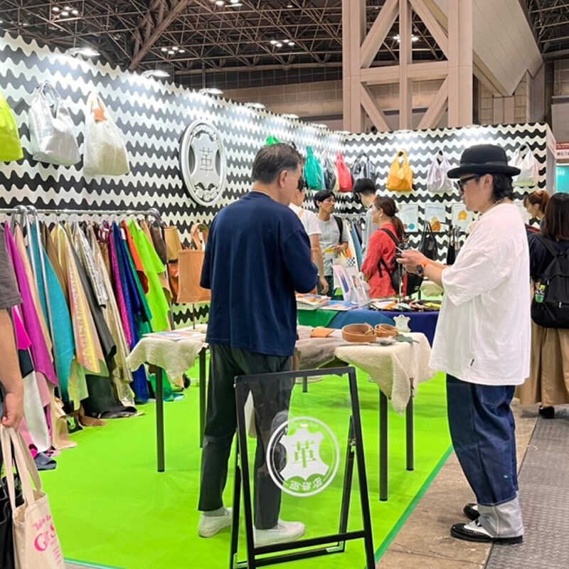 革単体ではなく、完成したレザー製品を具体的にイメージできる展示構成を行う。