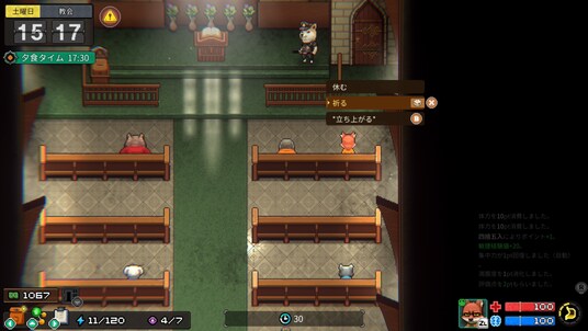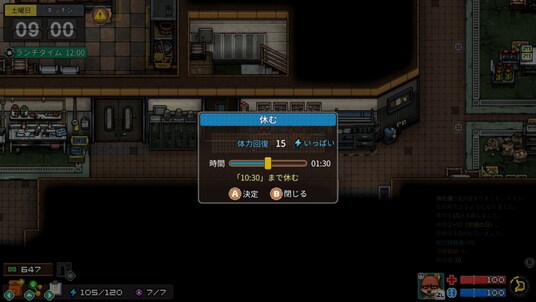 体力がなくなると何もできなくなるが、イスで休憩したり、睡眠やアイテムを使うことで回復できる。
