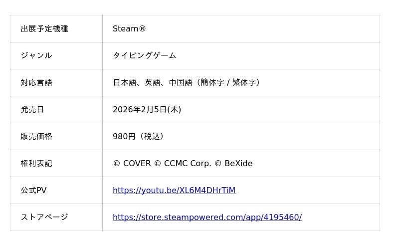 株式会社ビサイド(本社:東京都立川市、代表取締役社長:南治 一徳、以下ビサイド)は、インディーゲームプロジェクト「B-SiDE」として開発したSteam(R)向け新作タイピングゲーム『ホロタイプ お宝ゾンビの島』を、ホロライブプロダクションが提供する二次創作ゲームブランド「holo Indie」より、2026年2月5日(木)に発売したことをお知らせいたします。