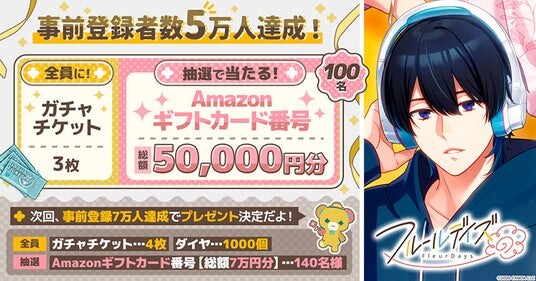 7万人を達成すると、「ガチャチケット計10枚」+「無償ダイヤ1,000個」に加え、抽選で140名様に総額7万円分のAmazonギフトカード番号が当たります。