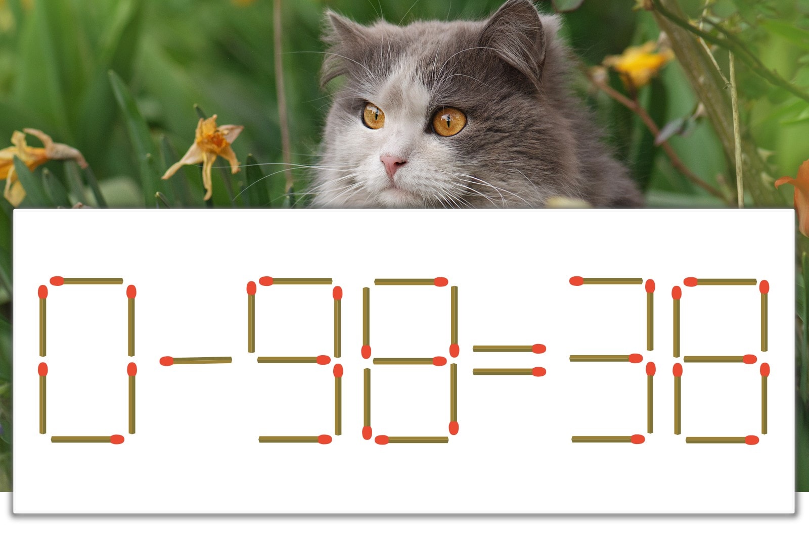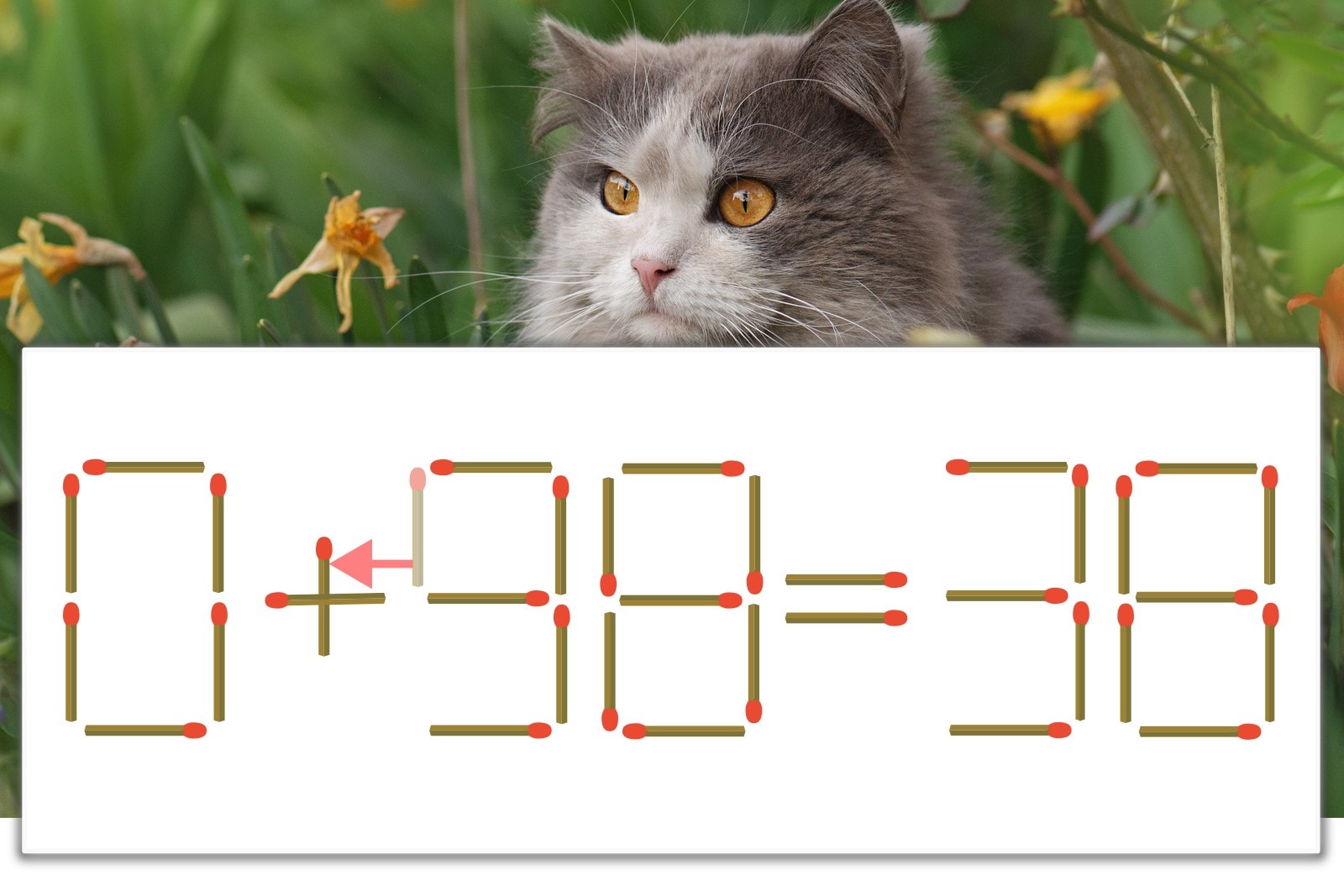 「9」を別の数字に変化させると答えが導き出せます。「9」のマッチ棒を1本移動して、「-」を「+」にしてみましょう。すると、「0+38=38」が成立します。