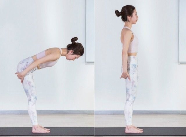 (2)一旦息を吸い、息を吐きながら両脚の付け根の関節を動かしながら上半身を前方に倒す