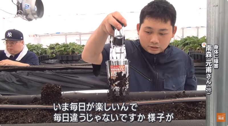 農園に最初から携わる、身体に障害のある南森元甫さん(26)もこの日の作業に参加。日を追うごとに少しずつ現れる苗の変化に目を輝かせ、「毎日が楽しい」と表情を輝かせます。