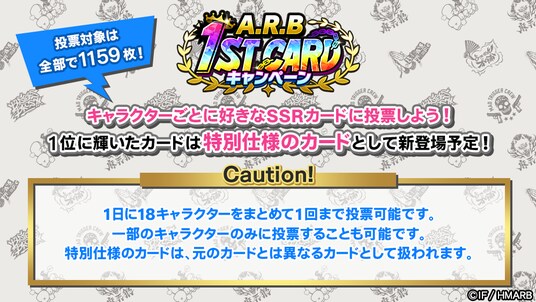 「A.R.B 1ST CARDキャンペーン」は、プレイヤーの皆様の投票によって、キャラクター別に1位のSSRカードを決める投票企画です。見事1位に選ばれた18枚のSSRカードは、後日特別仕様のカードとしてゲームアプリ内に登場予定!投票期間中、毎日キャラクター別に1票ずつ投票が可能ですのでお見逃しなく。