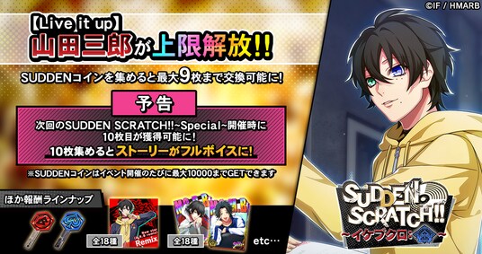 イベント期間中、KILLER SCRATCH!!をプレイするとライズ消費量に応じた確率でSUDDEN SCRATCH!!が発生します。SUDDEN SCRATCH!!をプレイすると、通常の報酬アイテムの他、限定アイテム「SUDDENコイン」を獲得することができます。「SUDDENコイン」を集めることで、「A.R.B remix」楽曲やレイズキー、イケブクロ・ディビジョンのデコステッカーに使えるブースターなどと交換することが可能です。また、ストーリーカード「SSR【Live it up】山田三郎」が上限解放され、最大9枚まで獲得できます。さらに、SUDDEN SCRATCH!!~Special~の開催時には10枚目が獲得可能となり、10枚集めるとカードストーリーがフルボイスに!詳細はアプリ内お知らせをご確認ください。