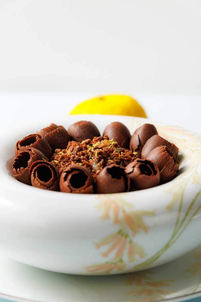 「ムース・オ・ショコラ・ユズ」は、カカオ75%マダガスカル産ショコラのムースにザクザクショコラとユズのコンフィを忍ばせ、トップにレモンゼストと花びらショコラで華やかに仕上げました(1,870円税込)。