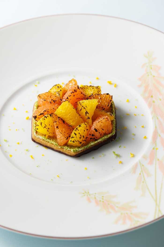 「ビスキュイ・フレ・アグリュム」は、フランス産バターを使ったオレンジ風味のビスケットをショコラでコーティングし、フレッシュなオレンジとピンクグレープフルーツをたっぷりトッピング(1,760円税込)。