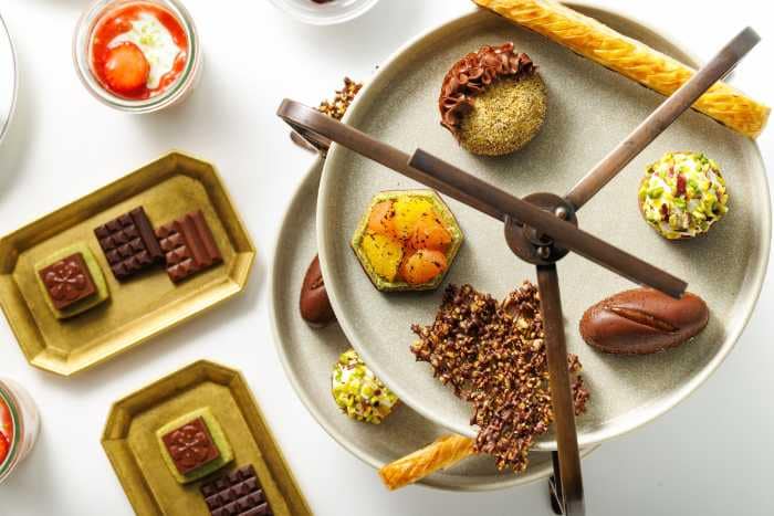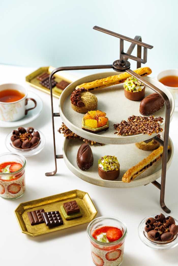 春の新作デザート3種をミニサイズで楽しめるほか、プラリネカフェやムース・ショコラ・カフェを包んだ「グレン・ド・カフェ・ショコラ」、サクサクパイ生地の「パン・スイス・ショコラ」、ポレンタやアーモンドパウダーの「フィナンシェ・ポレンタ」、クリームとピスタチオの「ケーク・ショコラ・ピスターシュ」、抹茶とアーモンドのプラリネを詰めた「カレ・ピュール・ブール・サクラ」など、約10種のクリエーションを楽しめます。