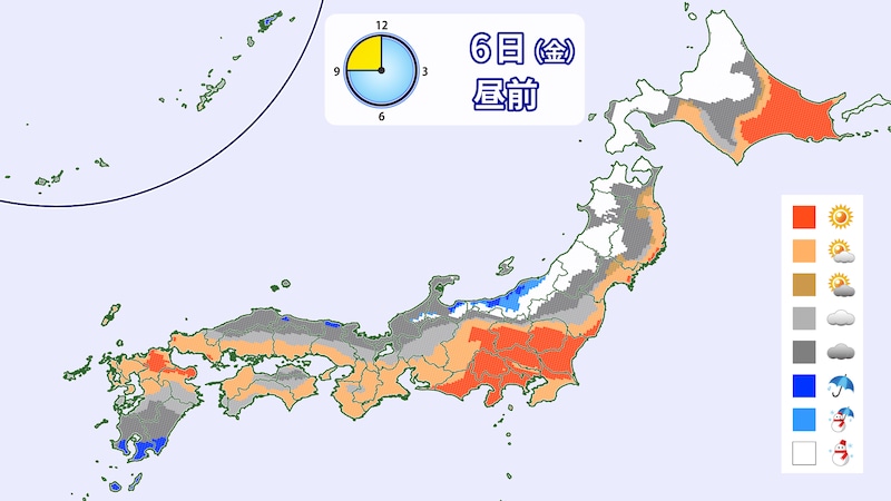6日(金)にかけては晴れやくもりの所が多いでしょう。西日本では気温が高く、シャバ雪となりそうです。高温のワックスが良いでしょう。