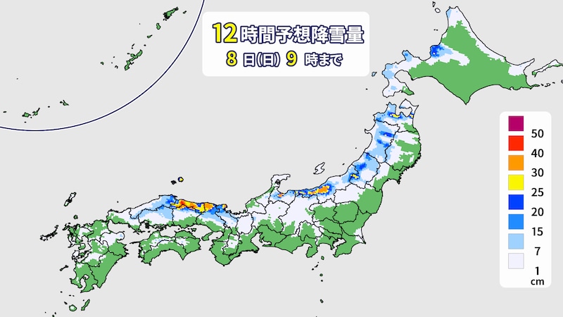 8日(日)の朝にかけては10~30センチほど積もりそうです。上空寒気が強まり、日中も大雪の可能性があります。特に新潟県側はドカ雪の可能性があるため、交通情報なども要チェック。