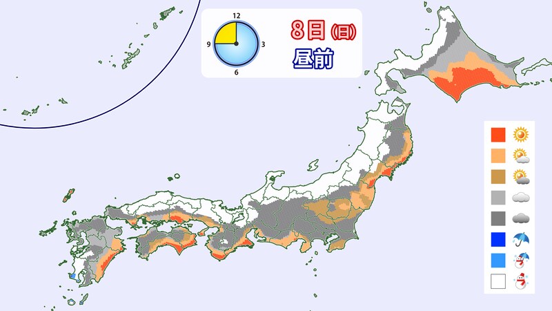 雪の範囲は日本海側中心で降り方もやや落ち着き、範囲も狭まるでしょう。風も弱まるため、前日までの雪が積もっているスキー場では、8日の日曜日が一番快適に滑ることができそうです。