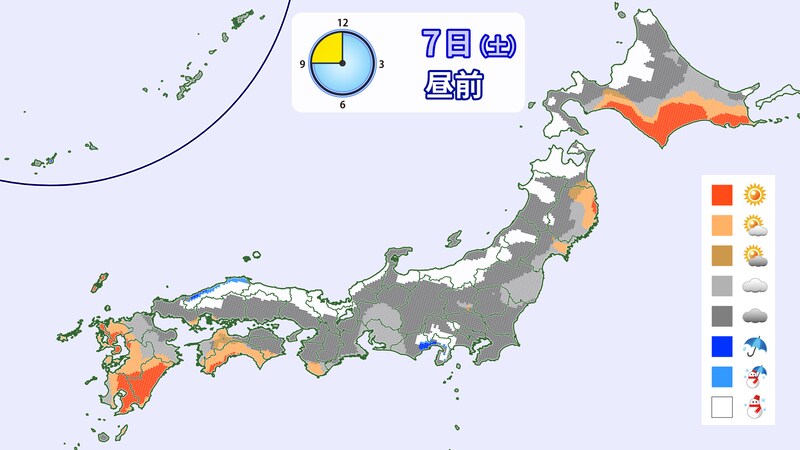 7日(土)は、寒気が強まり、西日本でも雪が降るでしょう。北海道は引き続き風が強く吹雪く見込みです。また風の収束により、大雪となる可能性もありそうです。