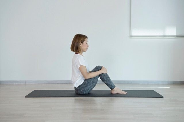 (1)床に体育座りして、背筋を真っ直ぐ立てる