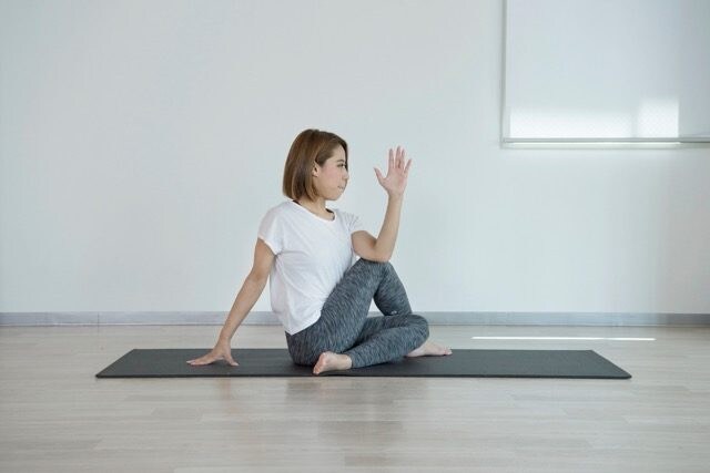(4)背筋を真っ直ぐにキープしたまま上半身を右側へねじっていき、ねじりきたところで3呼吸キープする