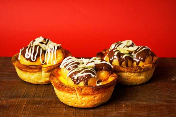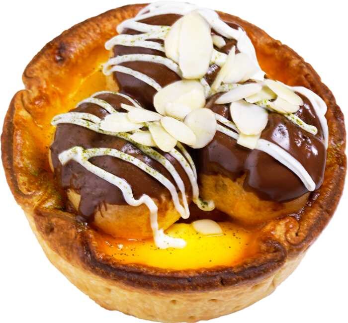 パブロの新作チーズタルトは、見た目に遊び心満点♡チョコでコーティングされたプチシューが並び、上にふわっと舞い降りるアーモンドスライスはまるでかつお節。