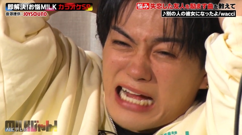 『NHK紅白歌合戦』を盛り上げた5人組ボーカルダンスユニット・M!LKの佐野勇斗が、恋人と破局して落ち込んでいる!? ……という設定で、カラオケ企画を実施。リーダーの吉田仁人が、有名失恋ソング『別の人の彼女になったよ』を歌って慰めると、強がっていた佐野がむせび泣きだし……!?