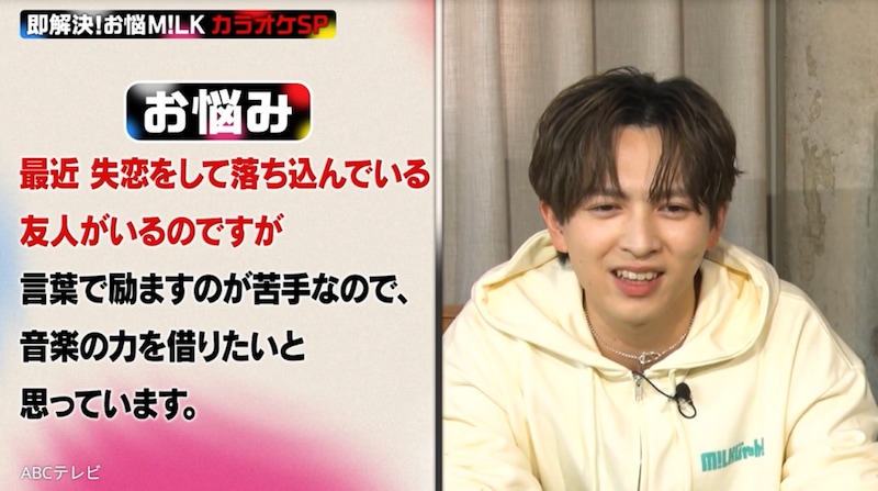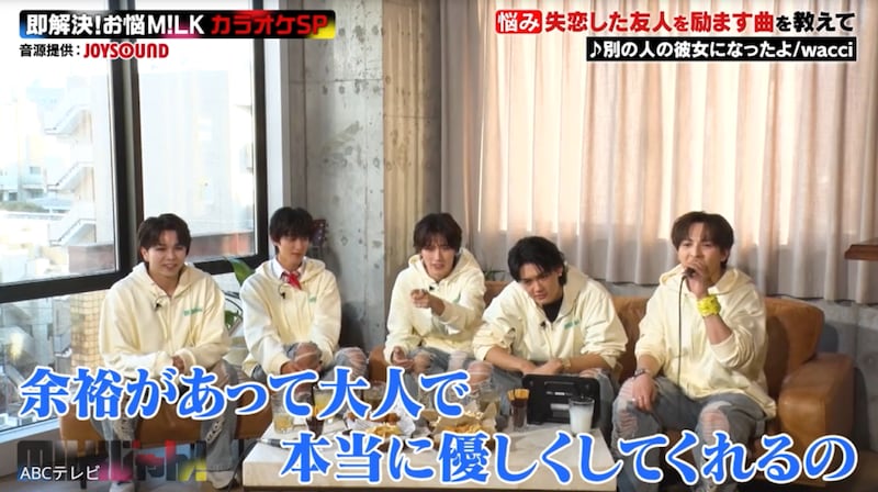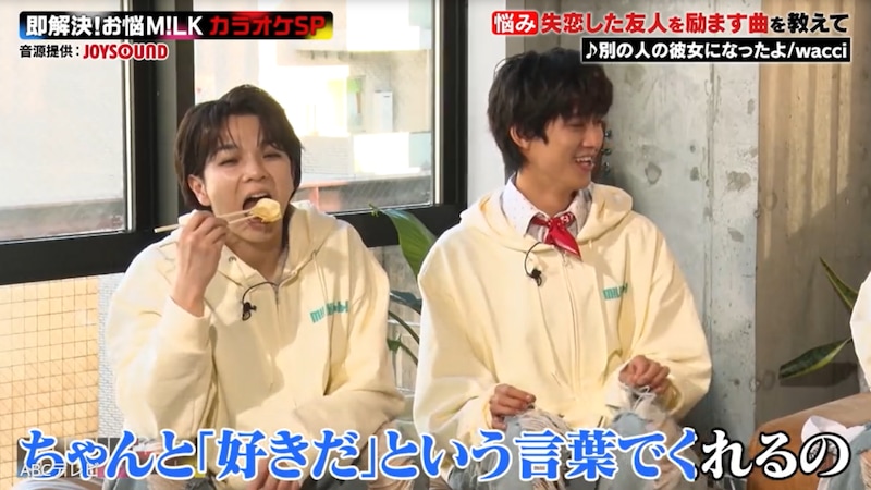 なお、M!LKのカラオケ映像は、彼らのABCテレビ初冠番組「M!LKじゃん!」2月3日深夜放送回で公開された。次週2月10日放送の同番組カラオケ企画後半では、“しおたろう”こと塩﨑&山中コンビが激レアデュエットを披露するほか、佐野が愛するM!LKに向けてあの名曲を熱唱する予定だ。
