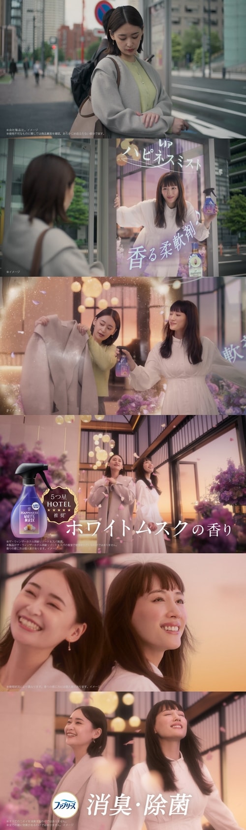 10月上旬から全国で新発売となる「ハピネスミスト」の新CMでは、コートや部屋のソファーにも柔軟剤のようないい香りをまとわせたいと願う女性のもとに、「ハピネスミスト」を持った綾瀬が登場。綾瀬が女性のコート、ソファー、カーテンに吹きかけた瞬間、周囲に5つ星ホテルのリッチな世界が立ち上がる2タイプのストーリーを通じて、「ハピネスミスト」なら洗えないものにもシュッとするだけで、しっかり消臭・除菌して、5つ星ホテルが認めた「ホワイトティーの香り」「ホワイトムスクの香り」が広がることを表現した。