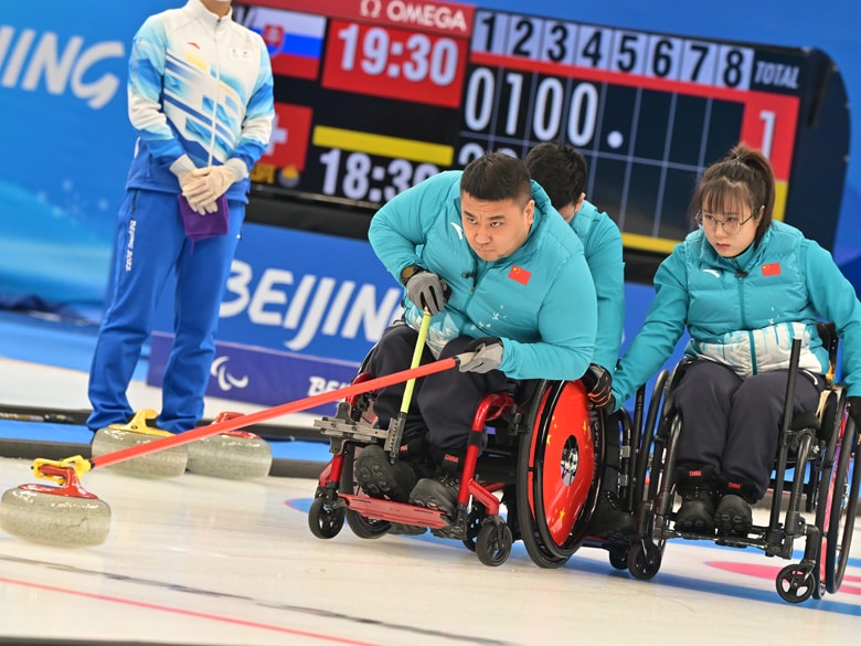パラリンピックでは、足に障がいがあり車いすを使用する選手が出場する車いすカーリングが行われる。オリンピックのカーリングと同じシート(氷のリンク)とストーンを使用し、ルールもほぼ同じ。しかし、大きく違う点が2つある。1つは、投球した後に氷をこする「スウィーピング」が禁止されていること。もう1つは、車いすを使用する選手が低い姿勢でもストーンを押し出しやすいように作られた棒状の「デリバリースティック」を使用して投球することだ。