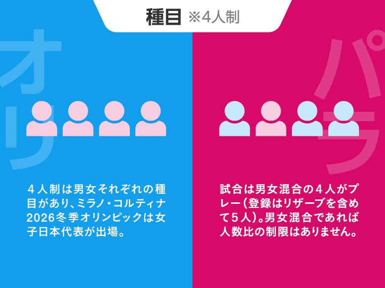 4人制は、パラリンピックでは男女混合(ミックス)で、オリンピックでは男女別でチームを組む。オリンピックの女子日本代表は、2018年平昌大会で銅メダルを獲得したこともあり人気が急上昇。2022年の北京大会でも銀メダルを獲得。今回のミラノ・コルティナ大会でも注目競技の一つだ。なお、男子とミックスダブルスは惜しくも出場権を逃している。