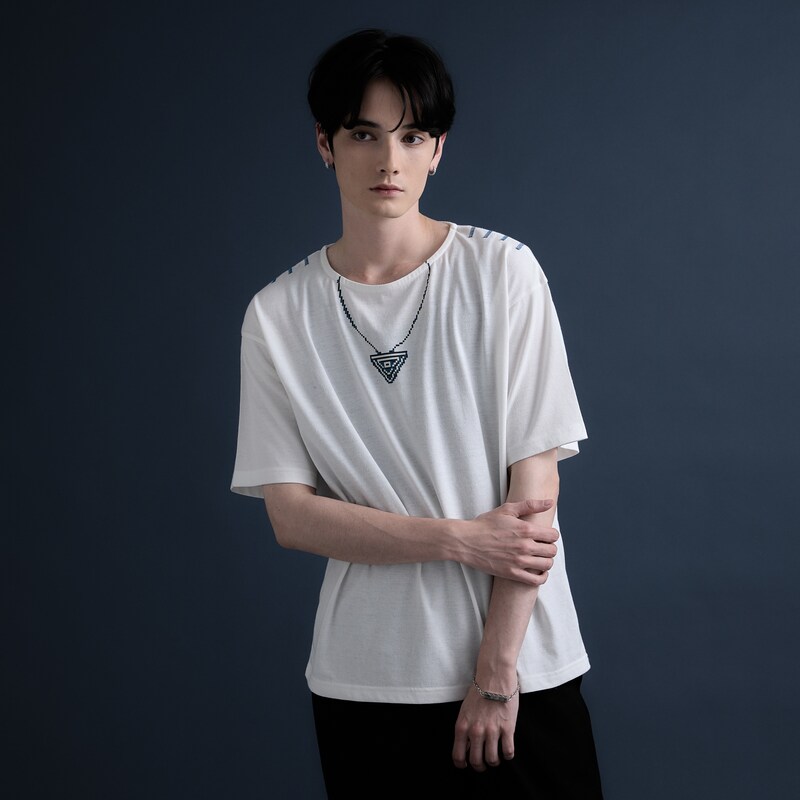 ホワイトTシャツの胸元にセンター長が着けているネックレスを配置。両肩には青いステッチを施し、センター長の服装を忠実に再現しています。