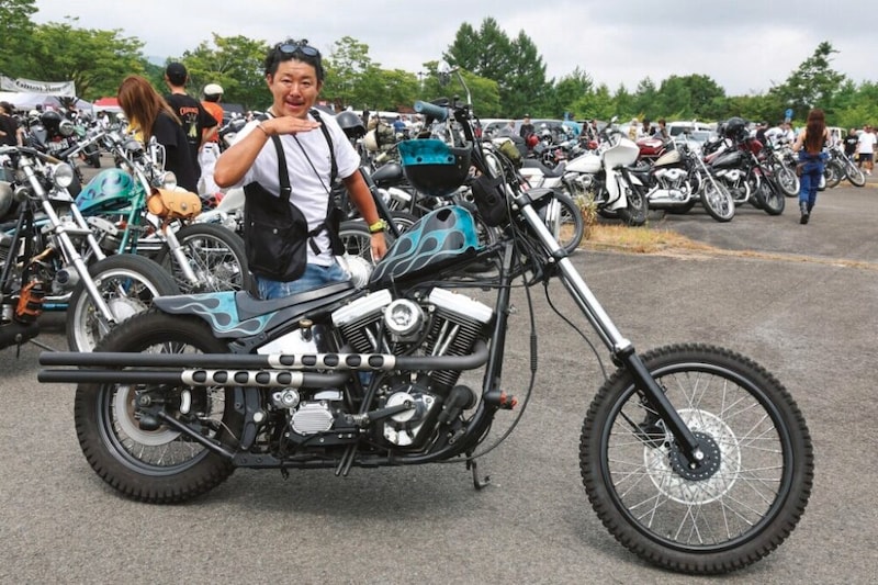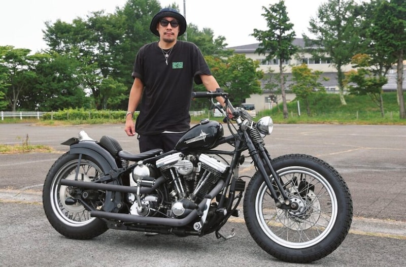 「オレのがイチバンカッコイイ〜」という高橋さんの愛車はダイナ系のフロントまわりを移植してストレッチ。エンジンはエボでEキャブに交換。真っすぐに伸びる長いエキゾーストも目立っています。個性的なシート一体のリアフェンダーは自慢のパーツ。リアブレーキはTCの4ポッド。ヘルメットのバイザーがタンクのフレイムスと同色にしているのもオシャレです。
