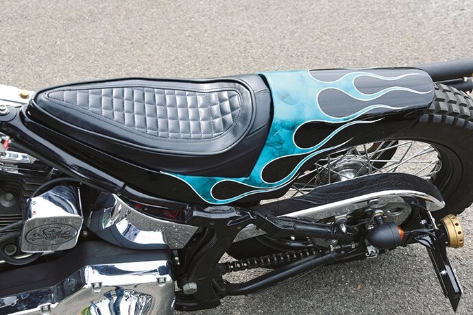 シートと一体化したフェンダーがシンプルでレーシー。ミッドコントロールと相まって走りそうなイメージ。フレイムスもカッコいい。
