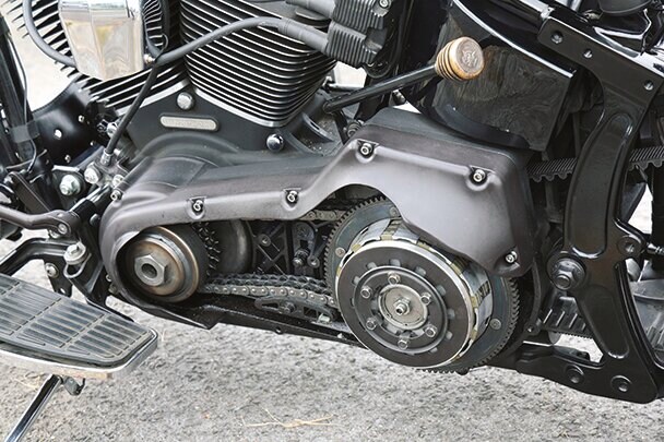 純正カバーをカットしたオープンプライマリーにビックリ。トラブルはないらしい。ハンドシフトへの変更もポイント。