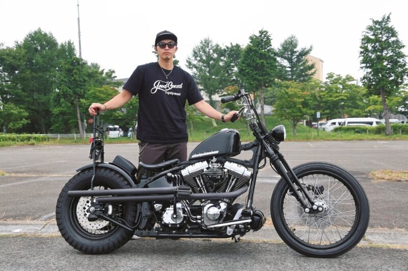 「ゴーストランは最高に楽しいです」とヒロミさん。テツヤさんと2台で会場にやって来たそうです。ヘリテイジのフロントまわりをスプリンガーにしたチョッパー。キャブもテツヤさんと同じくHSR。スポーツスタータンクとハイパイプ、それにリアのオフロードタイヤがかなりワイルドですが、さらにすごいのがノーマルのカバーをカットしたオープンプライマリーでした。