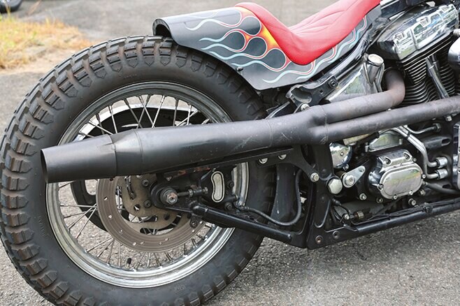 ツインカムのヘリテイジがフリスコ風のチョッパーに変身。ハイマウントしたスポーツスタータンクとノーマルよりコンパクトなS&Sのエアクリーナーのせいかエンジンの迫力も増して見えます。フロントホイールを19インチにしてオフロードタイヤをチョイス。タイヤギリギリのシート&リアフェンダー、アップしたステップとフレイムスのペイントなど、ヤンチャな感じがカッコいい!