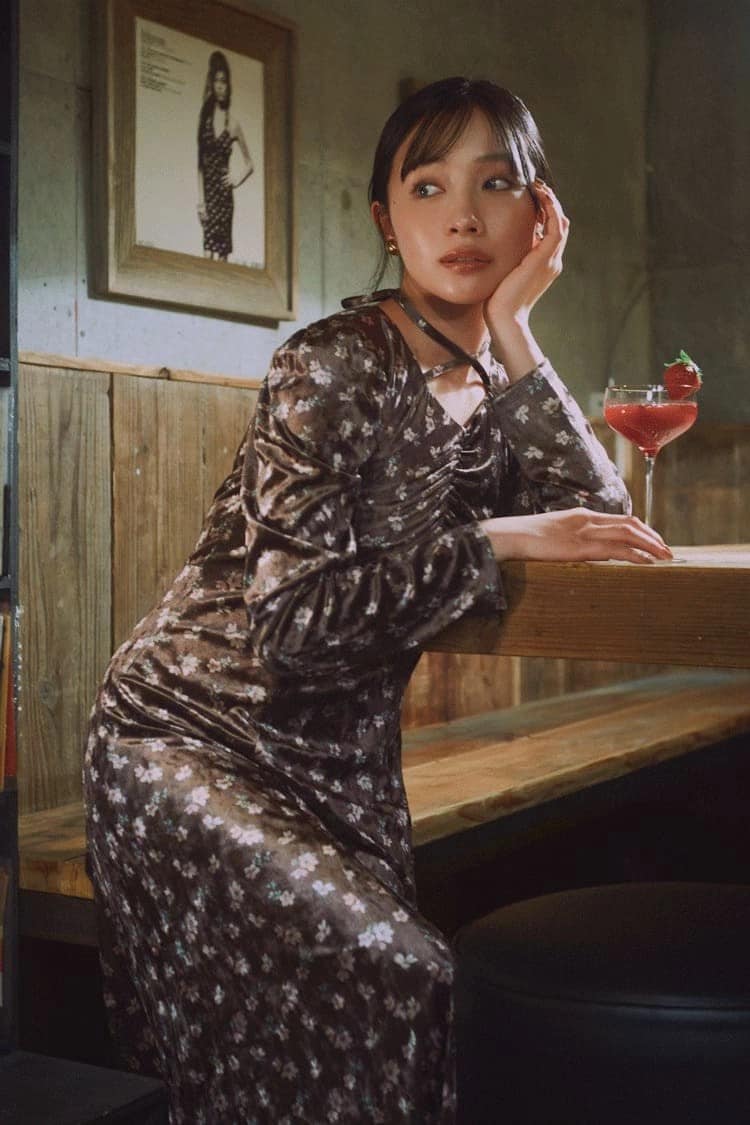 オトナな雰囲気のあるバーでは、光沢感のある素材で存在感をアピールすべし。ラインを拾うシルエットながら、小花柄がピュアな印象をつくってくれる。