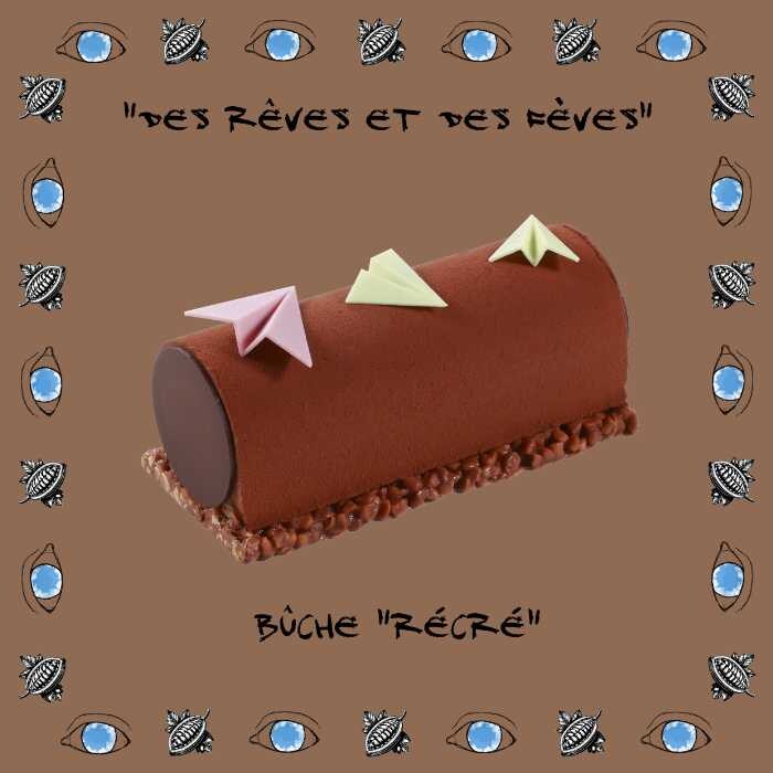 ビュッシュ レクレ:キャラメルクリームとヘーゼルナッツ入りのカカオムース。懐かしい記憶を呼び覚ます味わい。6×16.5×6cm/8,100円(税込)