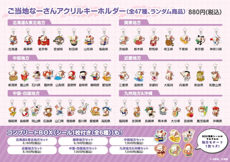 「ご当地なーさんアクリルキーホルダー」は、地方ごとのコンプリートBOXも登場。一部都道府県のダイカットシール付きで、全国47種類すべてを集めたい人はこちらがおすすめです。