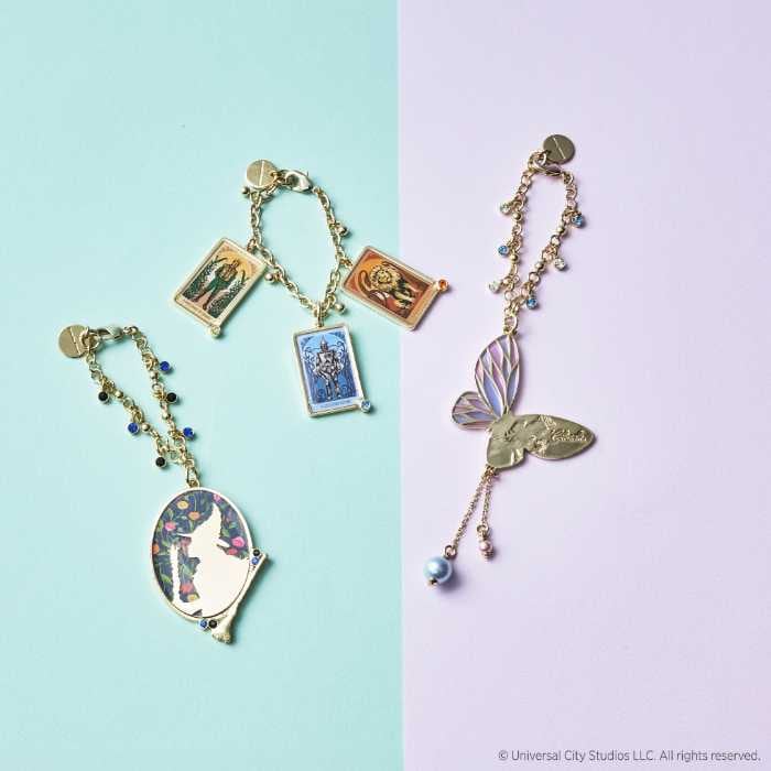 グリンダをイメージした蝶モチーフ、バッグ裏地と同様の総柄にエルファバのシルエットを配したデザイン、さらに物語に登場するキャラクターを表現したモチーフなど、コレクションしたくなるラインアップです。
